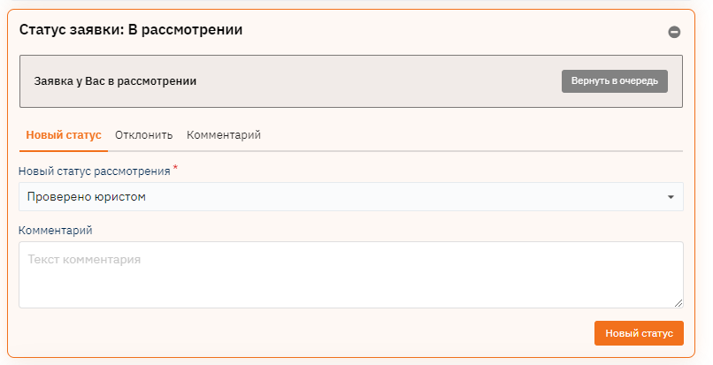For a positive decision, click the "New Status" tab, select the required status, and click the "New Status" button. You can add a comment that will be visible at all stages of decision-making.
