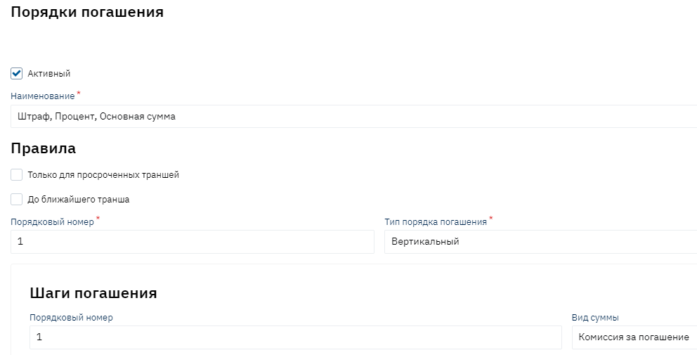 - Repayment priority separately for overdue tranches, current and future. In some cases, the priority for each period may differ. For example, for overdue tranches – vertically, for current and future – horizontally