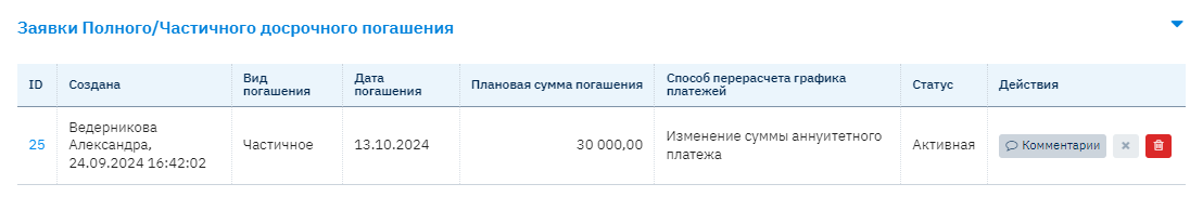The loan agreement may stipulate other early repayment conditions, for example, the need to submit a Partial Early Repayment Application, upon fulfillment of which early repayment of debt amounts and schedule recalculation with a change in payment amount or loan term occurs.