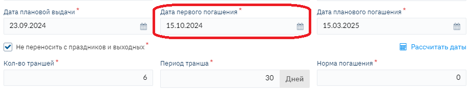 In the contract, the First Repayment Date field is set to 15.10.24, then all payment dates are calculated for the 15th (provided there is no setting for transfer to business days)