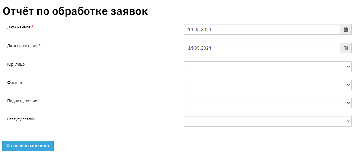To generate the report, navigate to "Reports" - "Analytical" - "Application Processing Report", set the period, and click the "Generate" button. Then select from the list of generated reports and download it to your PC.