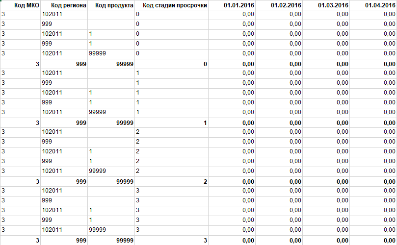 The report is generated from the start of the organization's operations until the specified date. The overdue portfolio is determined as of the first day of the month, and delinquency is calculated based on the actual number of days overdue. Grouping is done by MCC code, Region, and loan product code. If the code is not specified in the corresponding directories, the default code 99999 is assigned. Russia region code - 102011