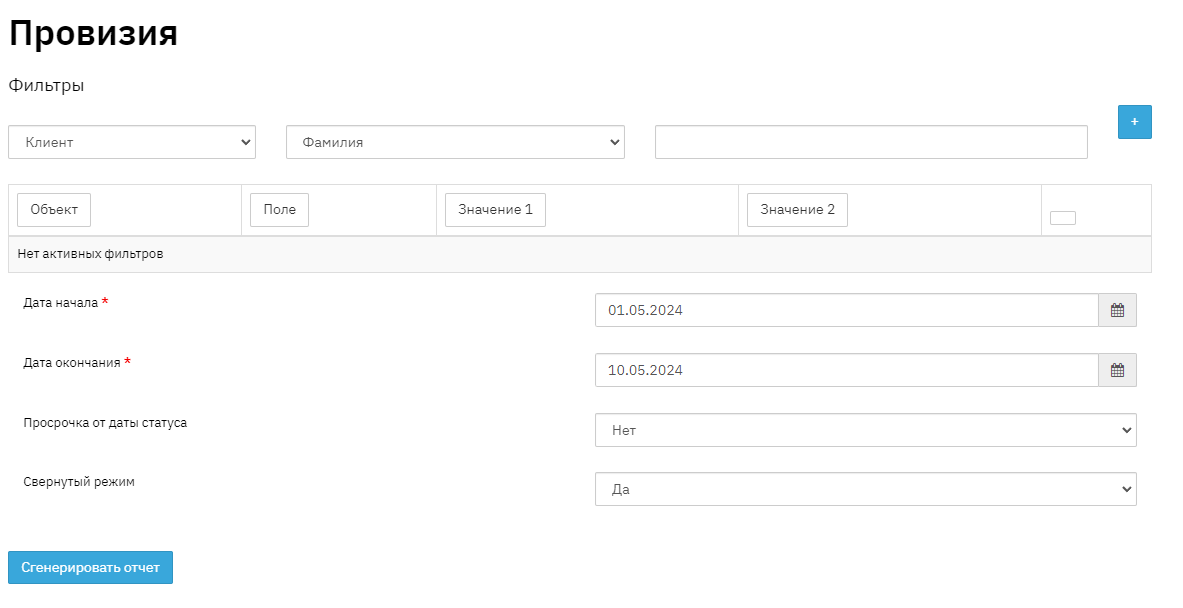 Provision in the program – is a report that shows loan classification according to FSA rules, reserve at the beginning of the period, changes in loan status during the period, reserve at the end of the period, and provision broken down by contracts and in summary mode.