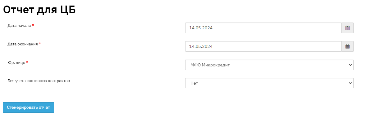 The report is generated for a period. Contains mode - "Excluding captive contracts" (YES/NO). A Legal Entity must also be selected for generation.