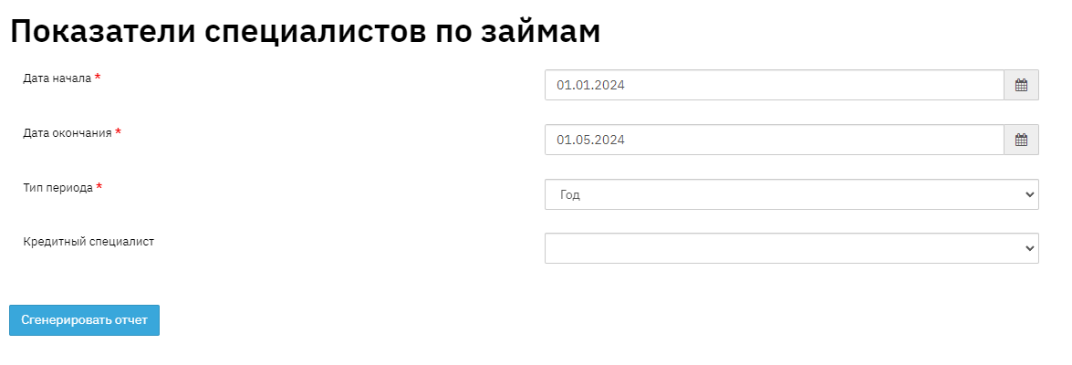 The report, developed according to the CGAP standard, is generated for a period, can be filtered by the "Loan Officer" field values and divided into subperiods: week, month, quarter, year.