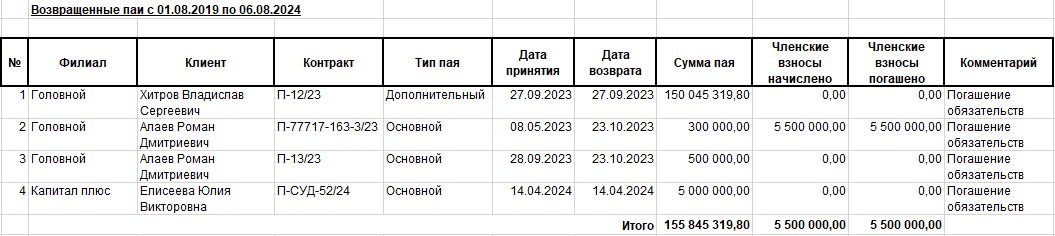 Returned Shares – the report is generated for a period, showing a list of returned shares for the specified period. The report period is filled in the report interface