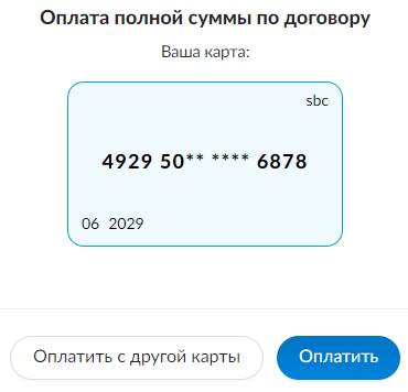 When clicking the "Pay" button in the "Early Loan Repayment" widget, a page for paying the full contract amount with linked bank card details and two buttons "Pay with Another Card" and "Pay" opens.