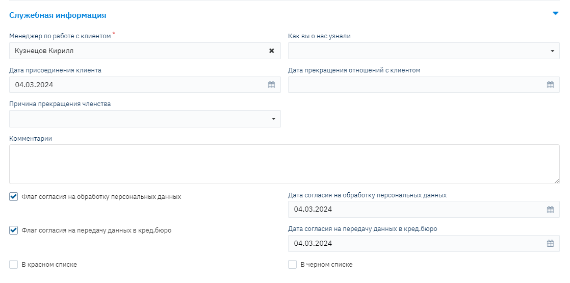 В данном разделе содержится служебная информация об агентах, менеджерах по работе с клиентом, источнике информации о компании, дате присоединения и прекращения отношений с клиентом, комментарии. Здесь также находятся флаги согласия на передачу данных в кредитное бюро и обработку персональных данных. Без проставления флага на согласие на передачу данных и обработку в Бюро кредитных историй, информация о данном клиенте не будет выгружаться в Кредитное бюро. Если согласие проставлено, нужно заполнить строки Дата согласия на передачу данных в кред.бюро и Дата согласия на обработку персональных данных.