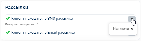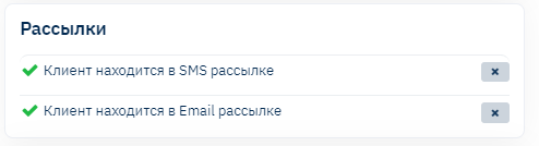 В программе Brainysoft можно осуществить SMS- и Email-рассылки. Виджеты показывают, находится ли клиент в списке SMS- и Email-рассылок. Если клиент отказался от получения информации по одному из 2 вариантов рассылки, сотруднику просто нужно нажать на крестик и исключить этого клиента из списка рассылок.