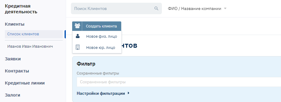 При нажатии на кнопку "Клиент" открывается окно с возможностью поиска, просмотра и редактирования уже существующего клиента, а также создания нового. Здесь же заполняются анкетные данные заемщиков, залогодателей, поручителей, агентов и т.д.