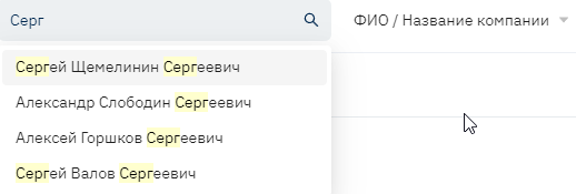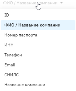 Для того чтобы воспользоваться поиском уже существующих клиентов, в строке поиска введите первые буквы фамилии, либо осуществите поиск по совпадениям последовательности букв. Поиск возможно осуществить по ID клиента, номеру паспорта, ИНН, телефону, названию компании (если это юр. лицо) либо по названию группы клиентов.