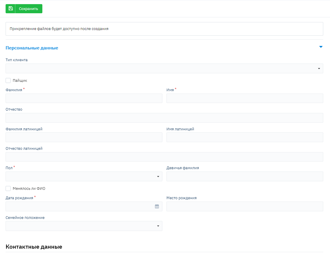 Обратите внимание, что поля, обозначенные звездочкой «*», являются обязательными для заполнения. Чаще всего это обусловлено необходимостью подавать эти данные в кредитные бюро, и эти данные являются обязательными для запроса. Не заполнив эти поля, мы не сможем сохранить клиента в базе, и программа выдаст соответствующее предупреждение.