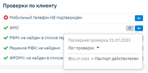 Данный виджет предоставляет информацию о проверках клиента по базе РФМ.
