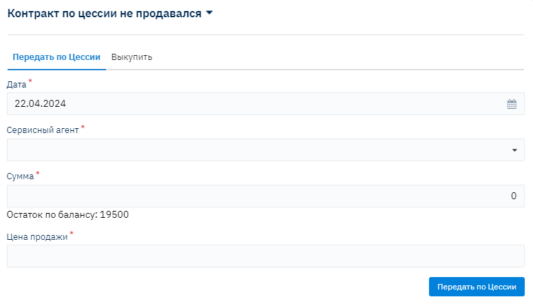 В открывшемся окне проставить необходимые данные и нажать на кнопку "Передать по Цессии". У Контракта появится признак "Продан" и информация по смене статуса.