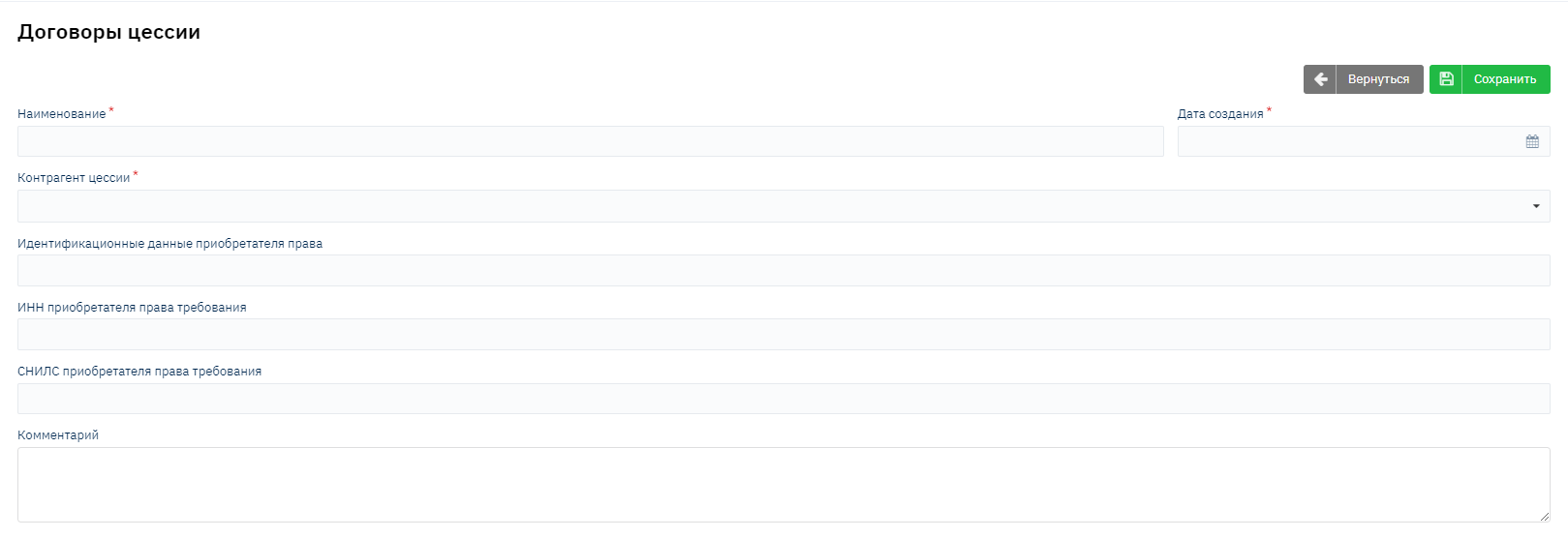 В первую очередь для этого необходимо заполнить справочник Контрагенты, который находится по адресу Админ - Справочники - Контрагенты. В данном случаем под Контрагентом понимается цессионарий.