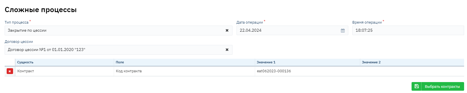 Для проведения данной процедуры вам необходимо зайти по адресу Админ - Сложные процессы. В появившемся окне выбрать Тип процесса - Закрытие по цессии, проставить дату операции и время, настроить фильтрацию по нужным параметрам и нажать кнопку "+", а затем кнопку "Выбрать контракты". На примере ниже выборка сделана по коду контракта: