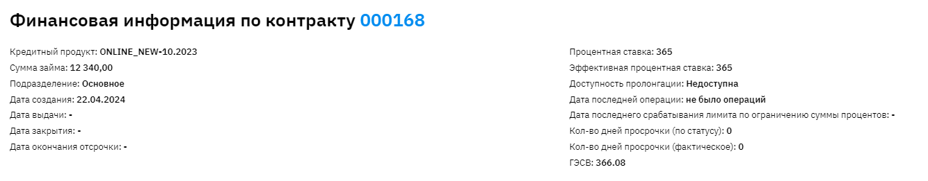 Информация по контракту: № кредитного контракта, название кредитного продукта, сумма займа, код или название подразделения в котором оформлен контракт, дата создания, дата выдачи, процентная ставка, дата последней операции.