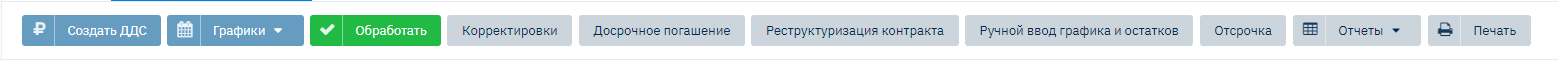 Кнопка «Обработать контракт» - производит соответствующие начисления на заданную дату. То есть функционал позволяет в ручном режиме произвести начисления процентов, штрафов и других сумм на заданную дату. (Следует отметить, что контракт обрабатывается автоматически раз в сутки).
