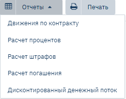 Движения по контракту - выводится отчет, который показывает все виды движений, которые были с момента выдачи по дату последней операции по контракту.