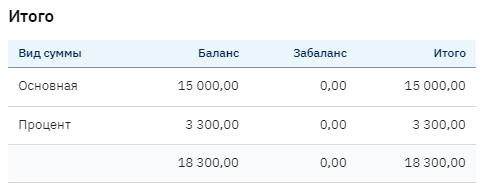 В таблица «Итого» - отображена вся задолженность по контракту начисленная (по виду сумм), но еще не погашенная в разбивке по виду учета (баланс/за баланс).