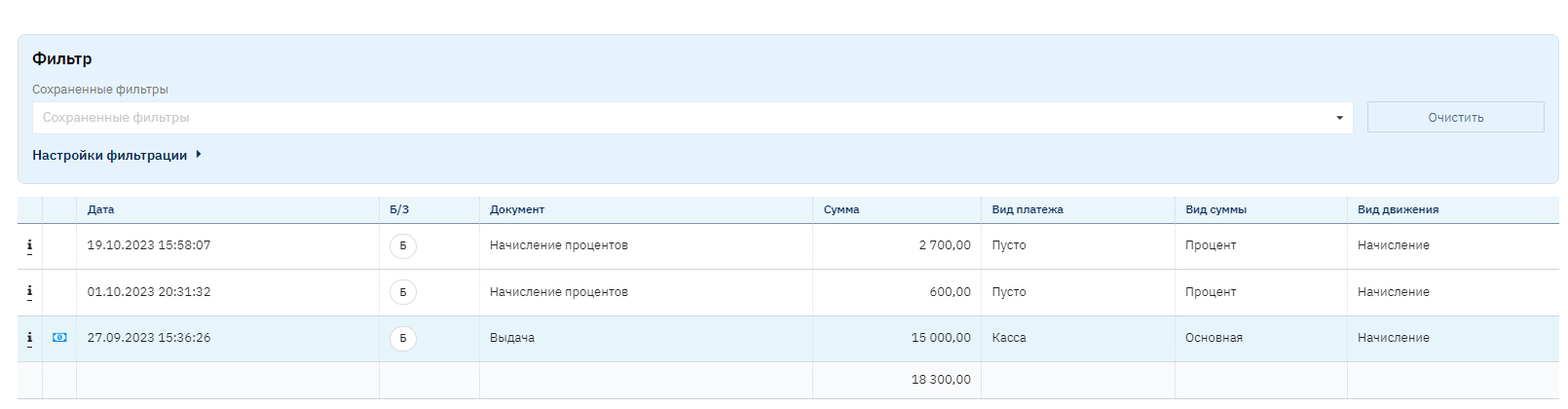 В крайнем левом столбце при наведении мыши на символ "i" открывается подсказка для пользователя, это поле носит информационный характер и показывает кто и когда создал ту или иную операцию. В случае, если операция связана с ДДС, при нажатии на номер ДДС отобразится информация о платеже.