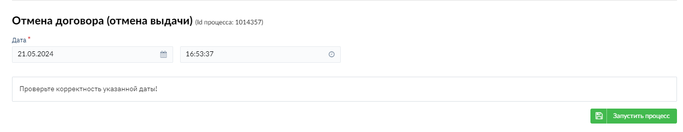 В открывшемся окне выберите Операцию "отмена выдачи", заполните дату и время и нажмите на кнопку "Запустить процесс".