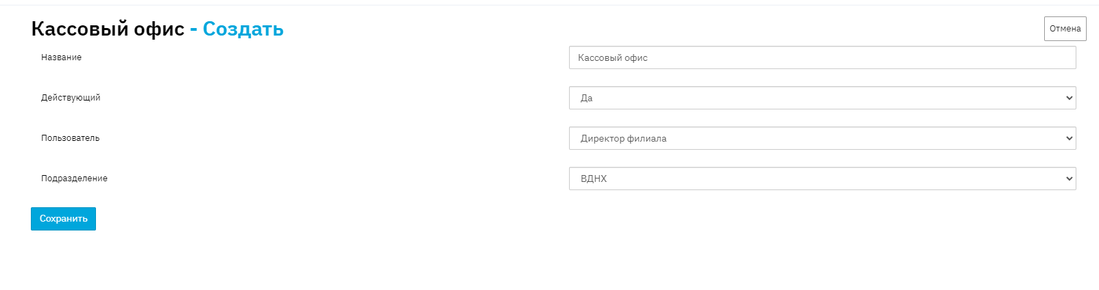 Для просмотра справочника перейдите по ссылке: «Cправочники» => «Кассовый офис». Для создания новой кассы нажмите "Создать".