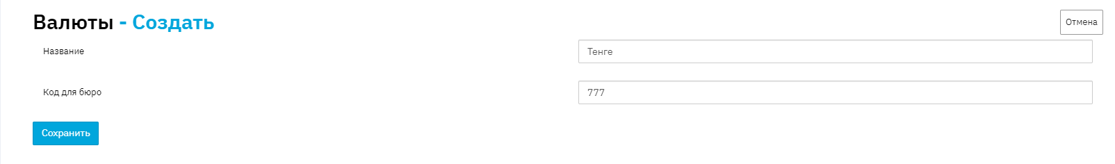 В новой форме заполните название валюты, укажите код для бюро и нажмите на кнопку «Сохранить».