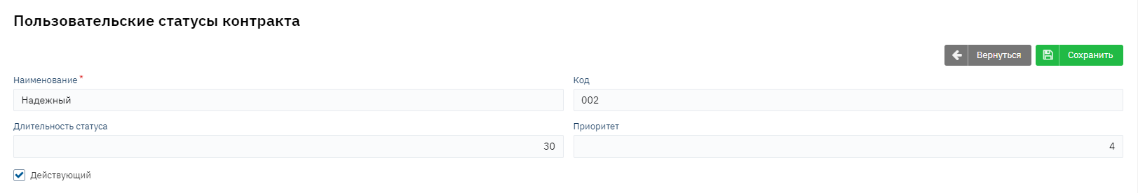Справочник, в котором хранятся пользовательские статусы контракта. Справочник позволяет компаниям создавать список собственных бизнес-статусов и проставлять эти статусы определенному контракту непосредственно пользователю. Статусы используются в информационных целях, либо для удобства сортировки и выборки в различных отчетах.