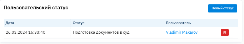 В правой части экрана расположен виджет «Пользовательские статусы контракта». Виджет сохраняет историю ранее проставленных статусов с указанием даты проставления статуса, статуса и пользователя, установившего статус.