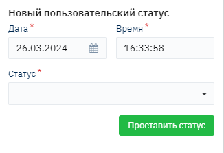 Выберете из списка нужный статус, по необходимости укажите дату и время статуса (по умолчанию текущее время) и нажмите кнопку «Проставить статус». Статус добавится в историю.