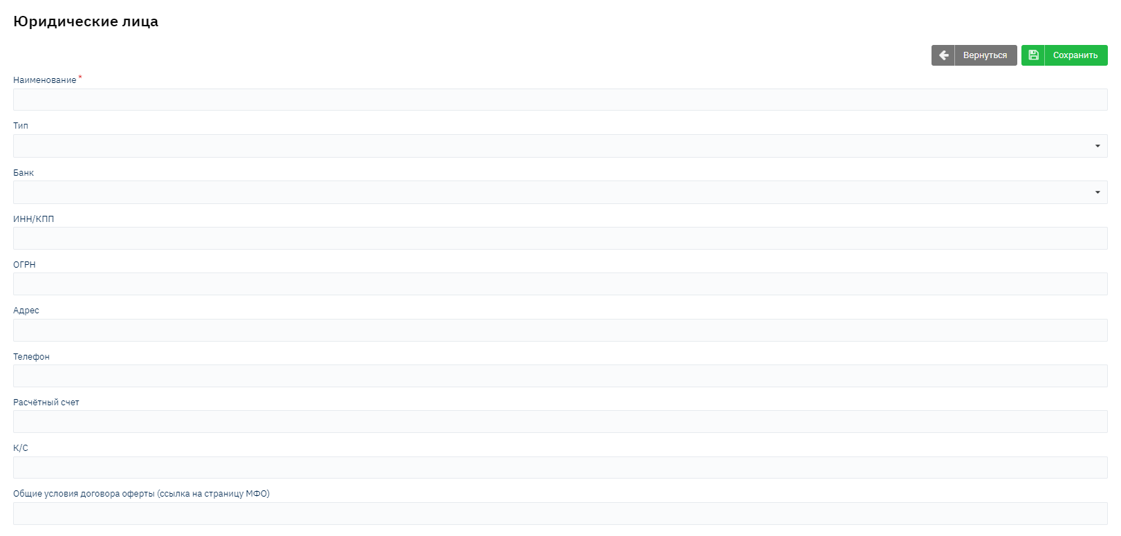 Юридические лица – в справочнике хранится название и реквизиты юридического лица (Организации). Информация из данного справочника будет выводиться в печатные формы договоров, доп. соглашений и другие документы.