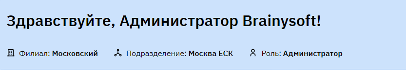 В данном блоке отображается информация о пользователе: Фамилия Имя или должность и логин, под которым совершен вход в систему, а также предоставленные ему права доступа, филиал и подразделение сотрудника.