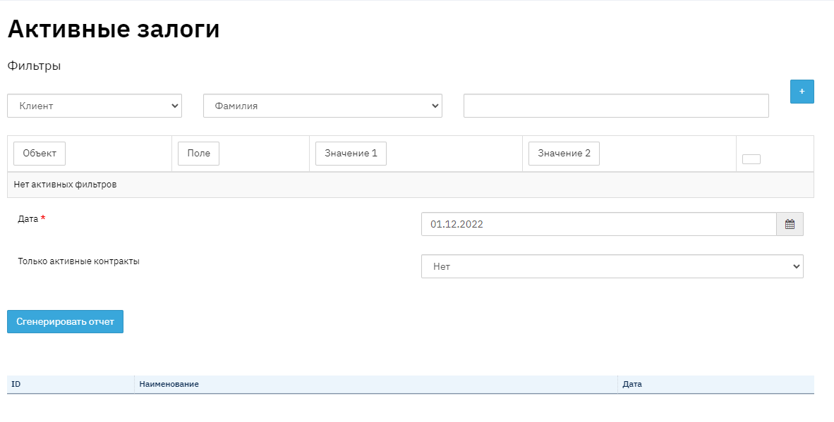 В отчет попадает информация по Активным залогам на указанную дату. Под Активными залогами программа Brainysoft считает займы,у которых на момент формирования отчета есть положительный остаток. Ниже мы с вами разберем элементы и поля отчета «Активные залоги» на заданную дату. Для того, чтобы сгенерировать отчет, перейдите по ссылке «Отчет» - «Базовый» - «Активные залоги», установите дату, при необходимости выберите соответствующий фильтр, и нажмите кнопку "Сгенерировать". Затем выберите из списка сгенерированных отчетов и скачайте его на свой ПК.