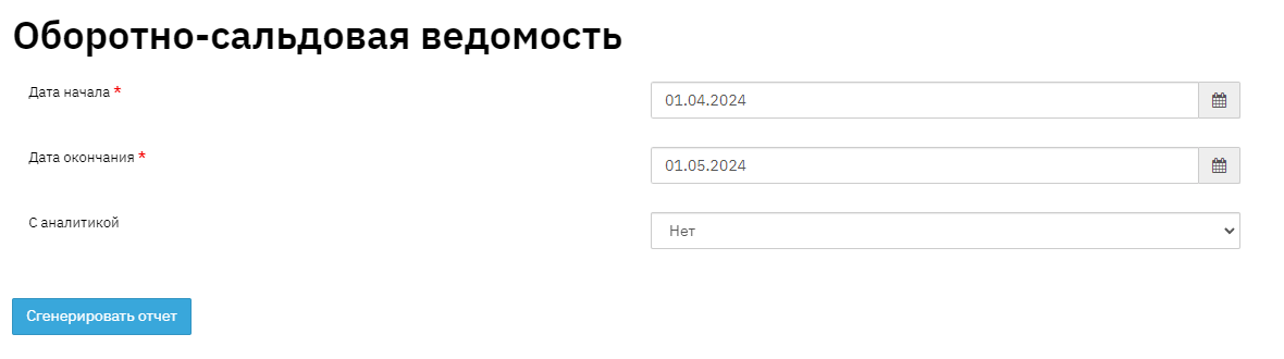 Для того, чтобы сгенерировать отчет, перейдите по ссылке «Отчет» - «Аналитический» - «Оборотно-сальдовая ведомость», установите период дат, при необходимости выберите соответствующий фильтр, и нажмите кнопку "Сгенерировать". Затем выберите из списка сгенерированных отчетов и скачайте его на свой ПК.