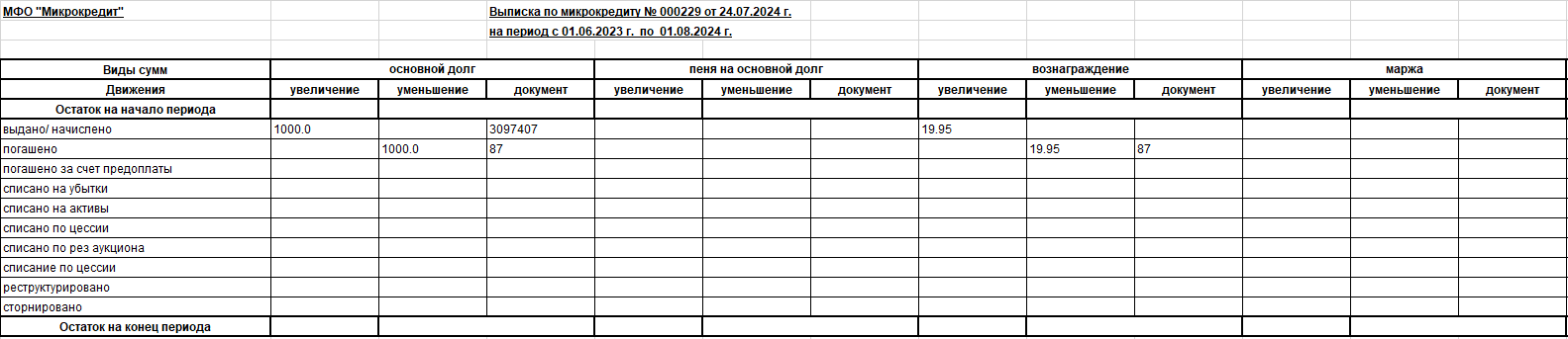 Задайте период и введите номер контракта, так же можно задать фильтр по забалансовым суммам, если поставить галочку, то в отчет начисленные за балансом проценты и штрафы не войдут. Горизонтальная строка показывает все виды сумм задействованные в этом контракте -Основная сумма, процент, штрафы. Так же по каждому виду сумм, есть разделение на признаки: