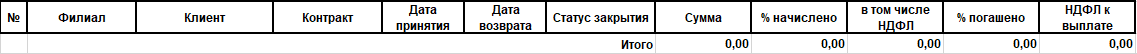 Возвращенные депозиты – отчет формирует список возвращенных депозитных контрактов за период с подробной информацией о выплаченных процентов, и начисленных НДФЛ. В интерфейсе отчета заполняется период отчета, нажимам на кнопку «Сгенерировать».