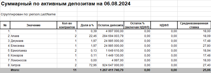Суммарный по активным депозитам – отчет показывает активный депозитный портфель, в данном отчете есть фильтр, по которому можно сформировать этот отчет