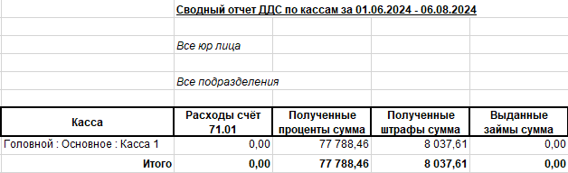 Отчет выводит суммарные данные погашения займов по кассам с разбивкой по полученным процентам, полученным штрафим и выданной сумме займа.